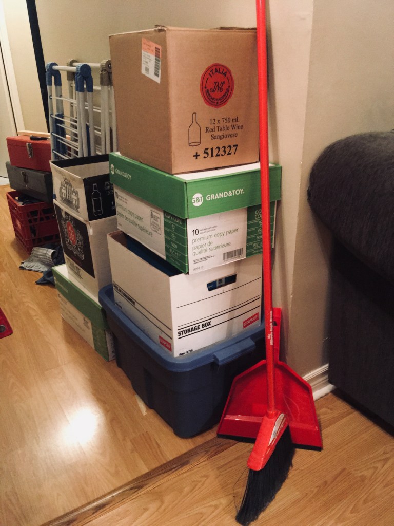 This project started last October, and I’ve made significant progress.  Among several accomplishments to date, I am especially proud of having banished the pigeons from the balcony; I have also managed to sort through a cache of storage bins that had been conspicuously squatting in my son’s bedroom while he was away at university.  The next big job will be to slog my way through a mammoth stockpile of boxes.  Each of these boxes is packed with forgotten and mostly useless miscellanea, and they’re crammed in and stacked to the ceiling of my so-called “walk-in” closet.